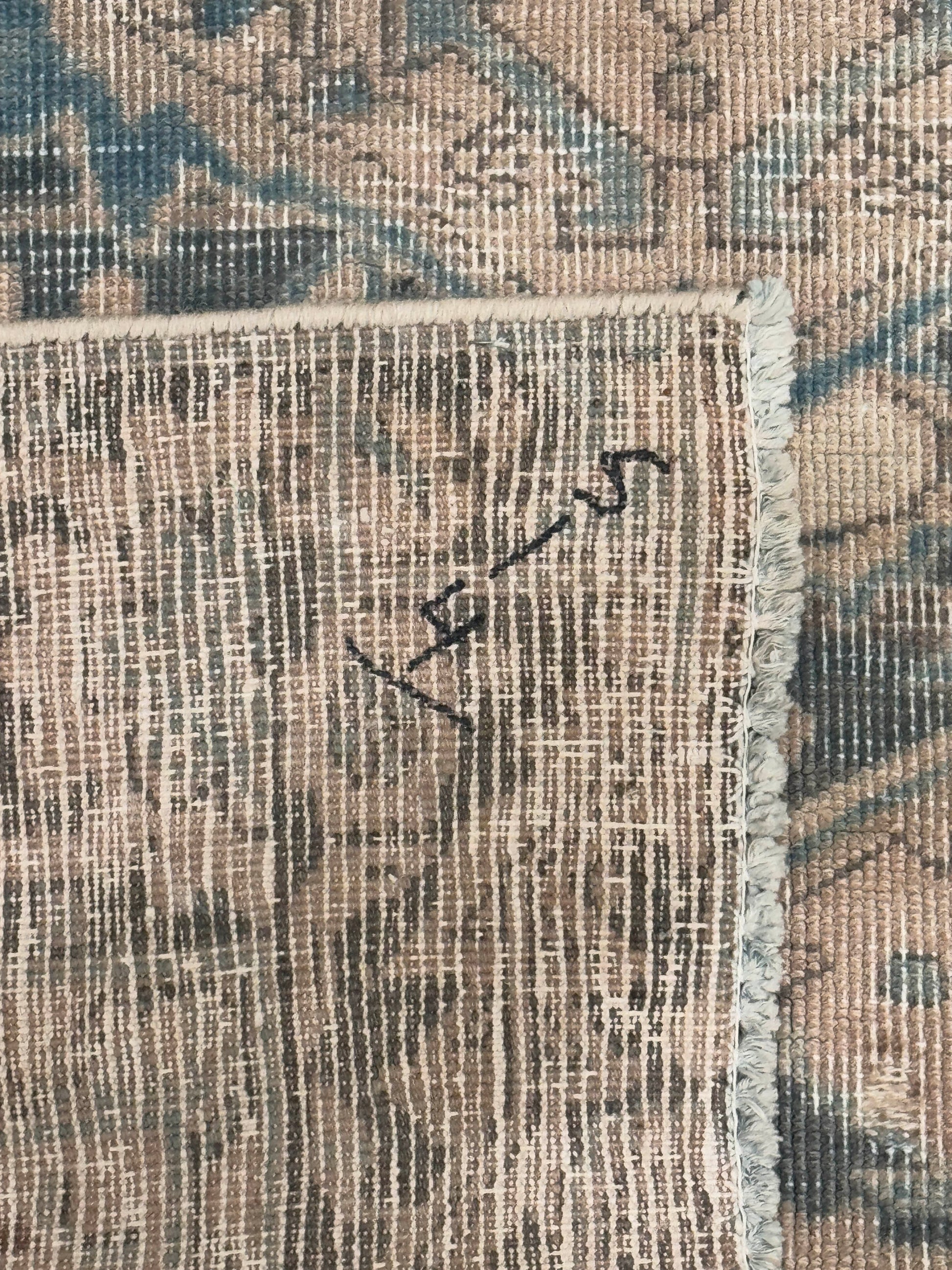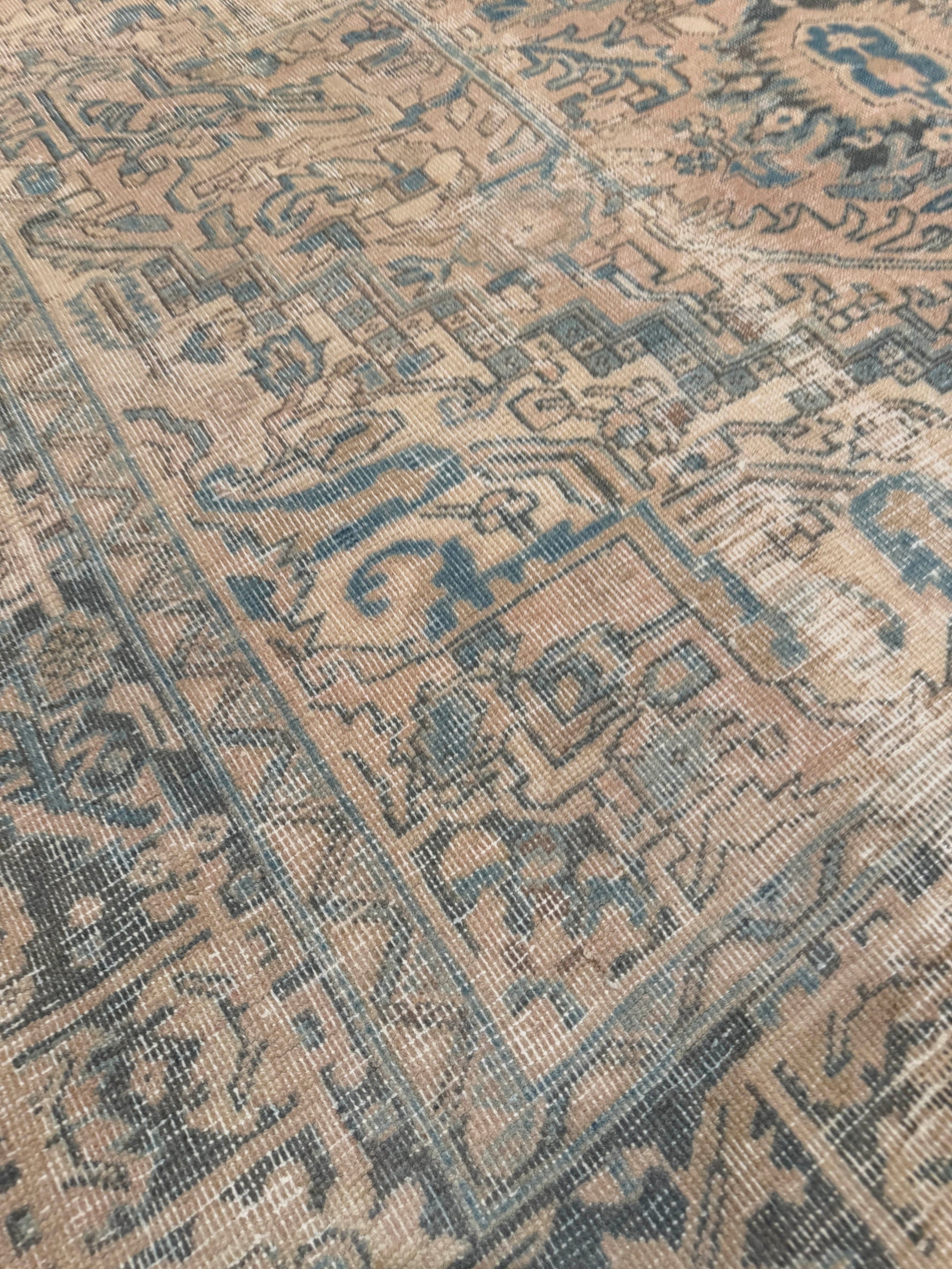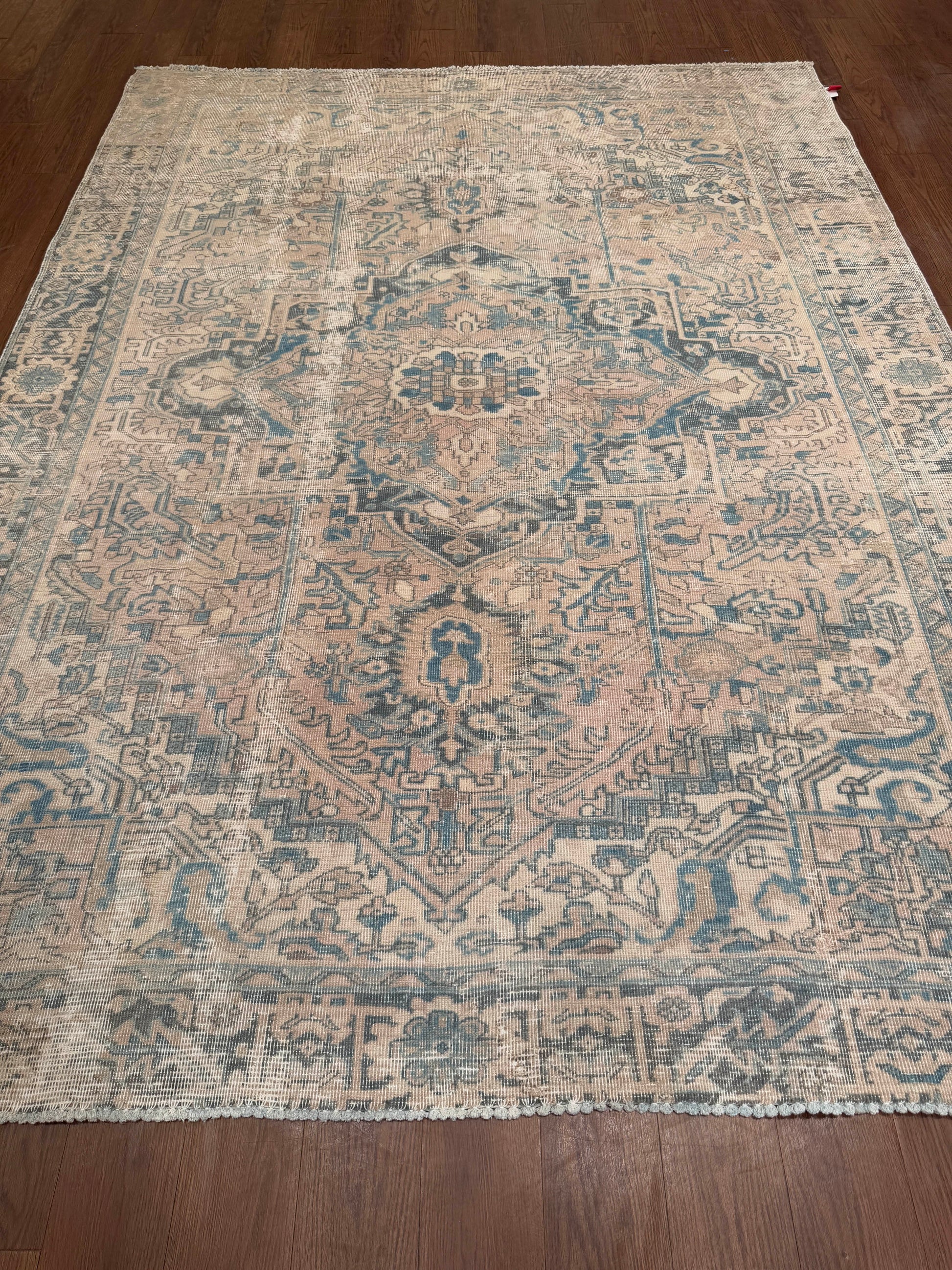 This handwoven rug features a beautifully balanced geometric medallion surrounded by intricate floral and tribal motifs, softly faded for a timeworn appeal. The palette of dusty rose, muted teal, and ivory creates a calming yet sophisticated atmosphere, ideal for both modern and classic interiors. Its distressed texture highlights the craftsmanship and artistry behind its design, bringing warmth and authenticity to any space.