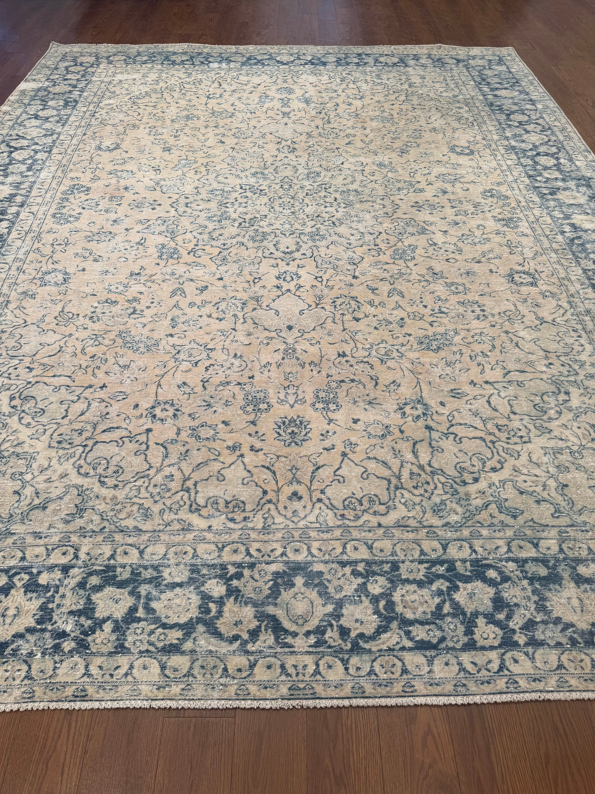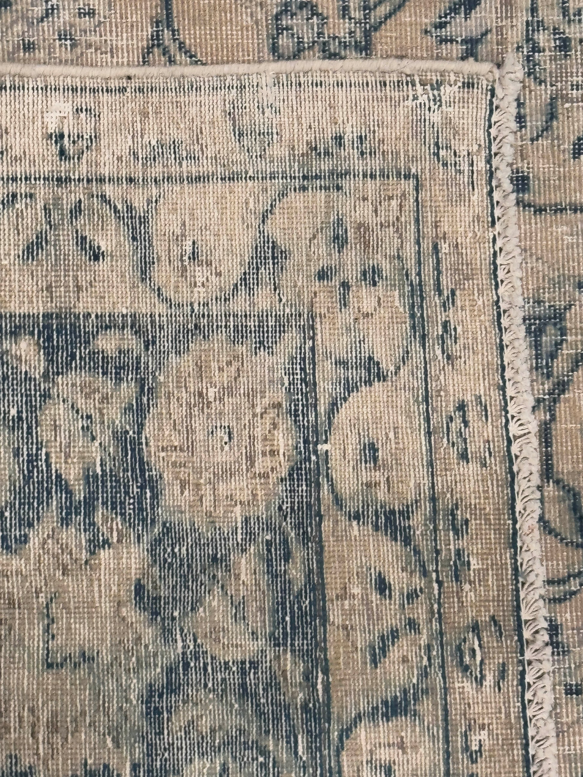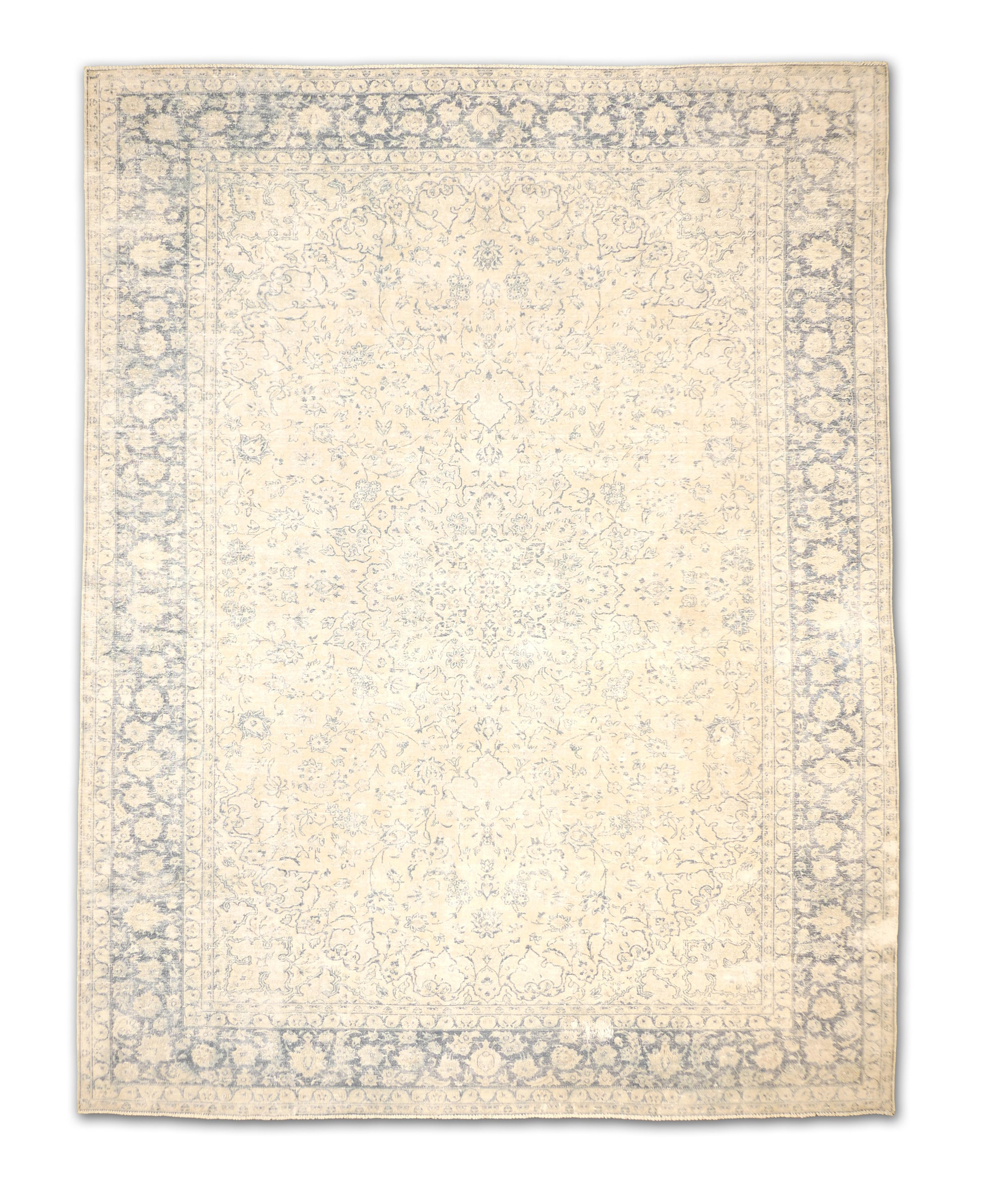 This elegant handwoven rug showcases a refined Persian-inspired floral pattern with a central medallion. The faded ivory background is beautifully complemented by soft blue detailing throughout the field and border, giving it a timeless and serene aesthetic. Its distressed finish enhances the antique look, making it a versatile piece for both classic and transitional interiors.