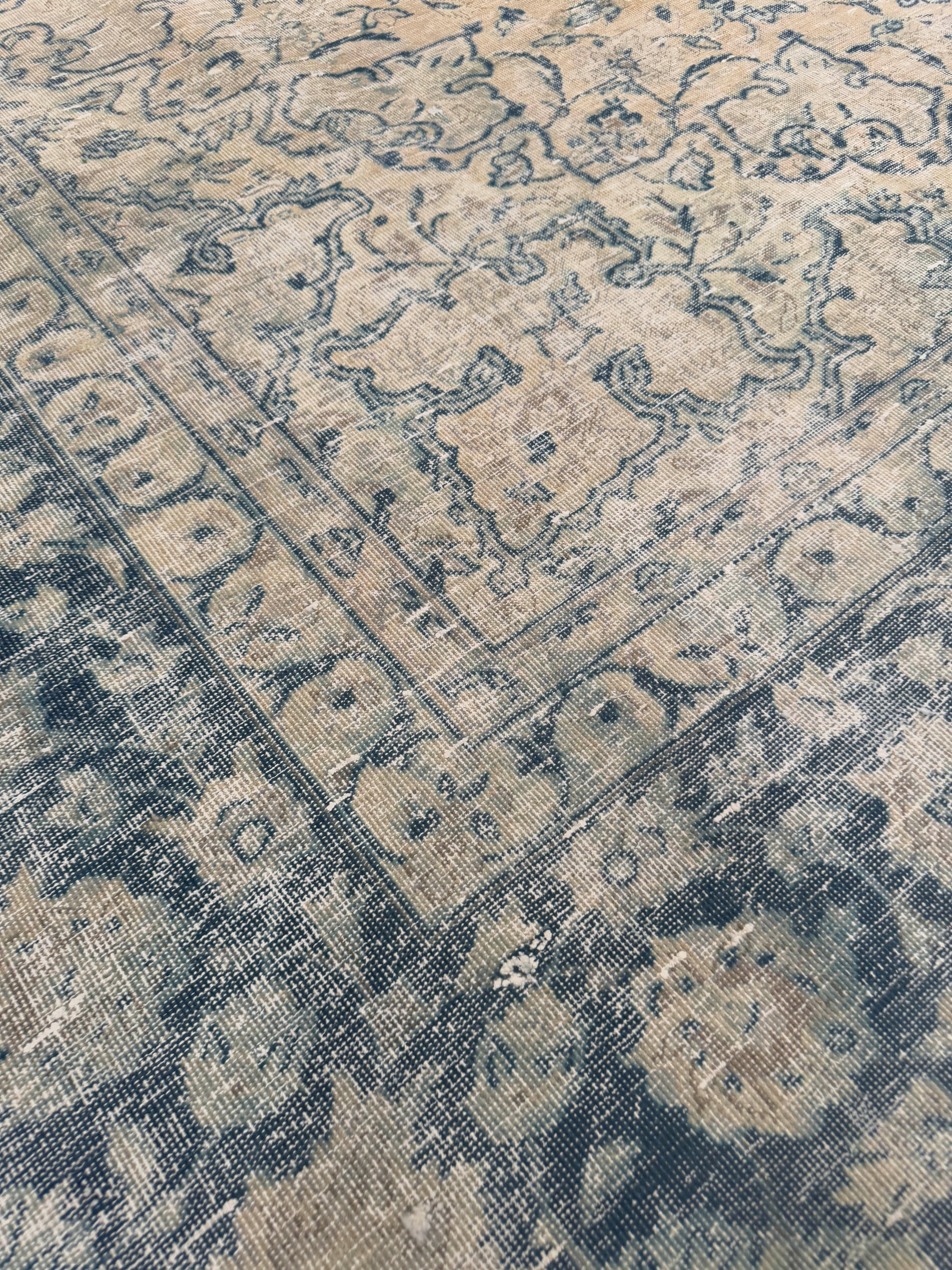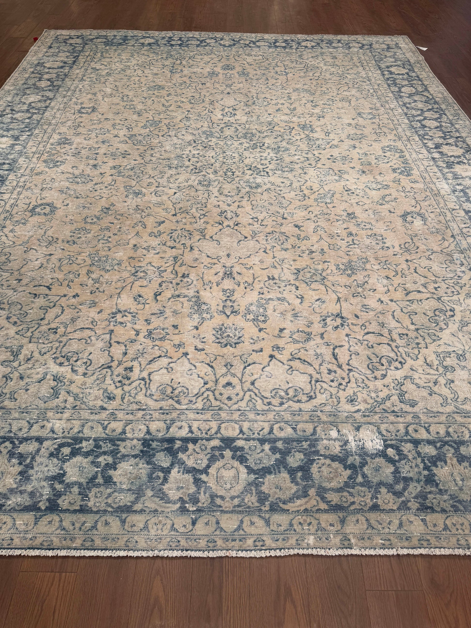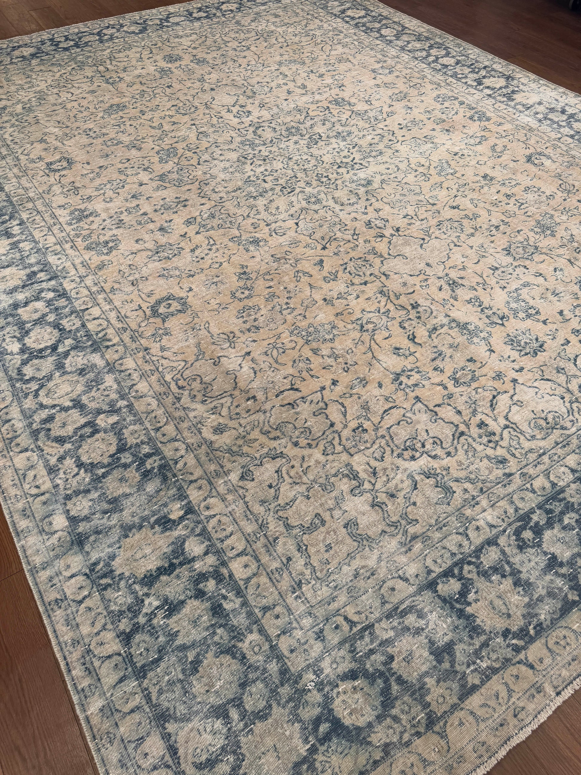 This elegant handwoven rug showcases a refined Persian-inspired floral pattern with a central medallion. The faded ivory background is beautifully complemented by soft blue detailing throughout the field and border, giving it a timeless and serene aesthetic. Its distressed finish enhances the antique look, making it a versatile piece for both classic and transitional interiors.