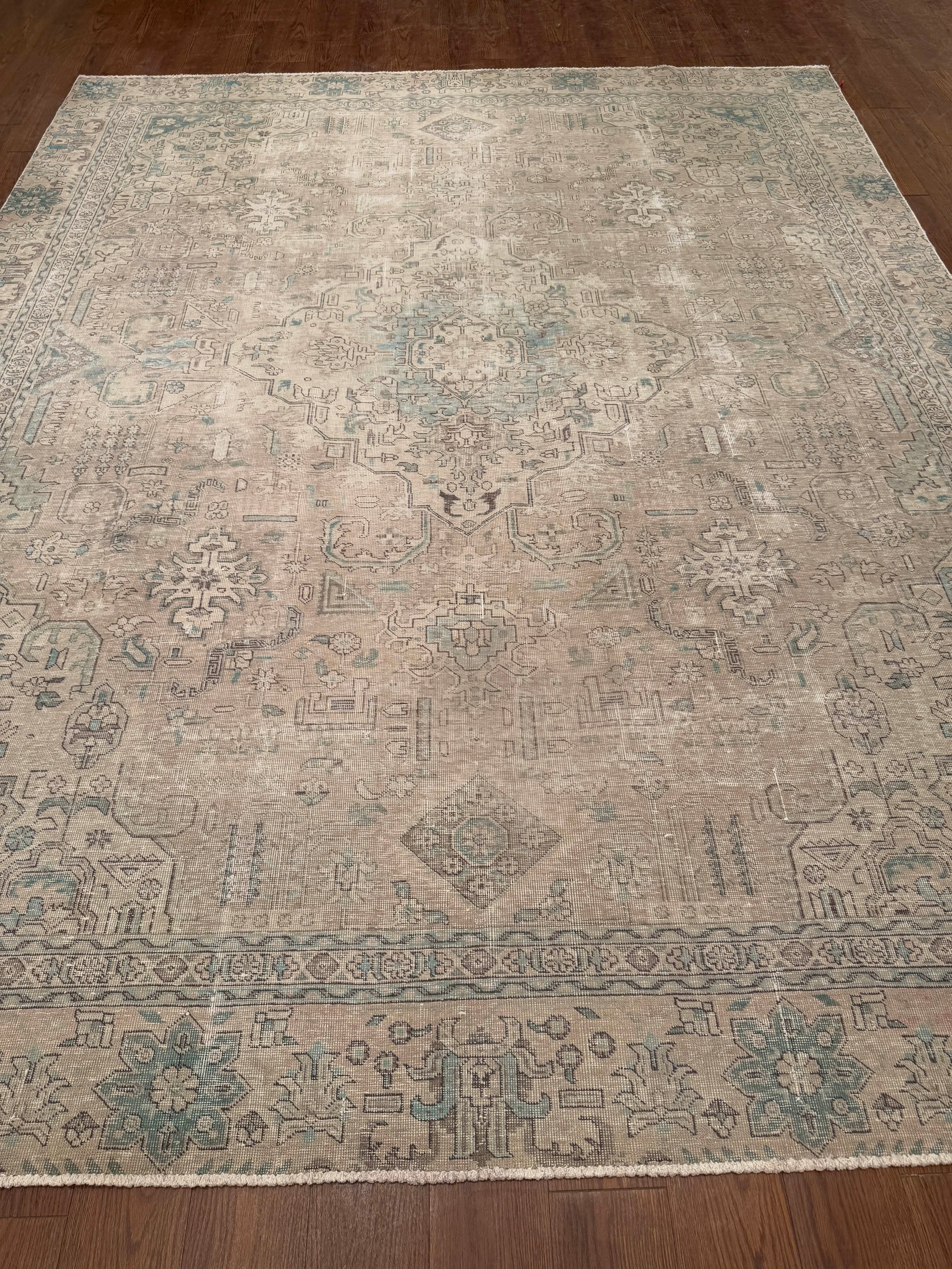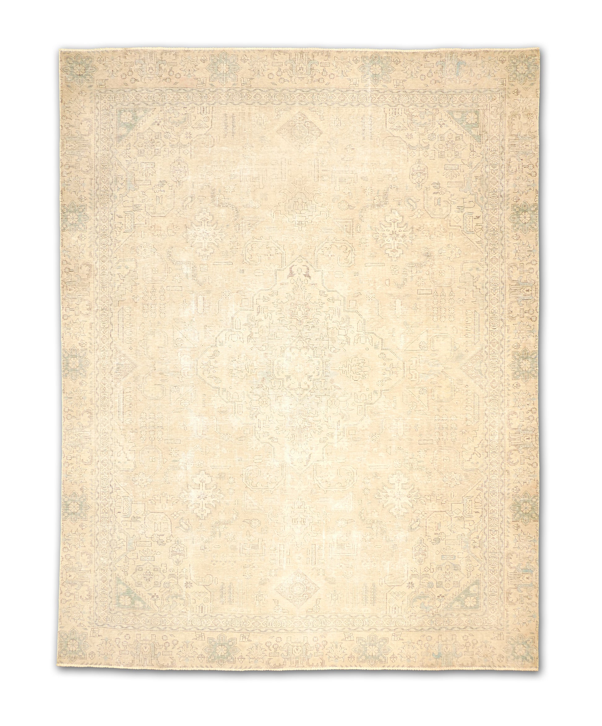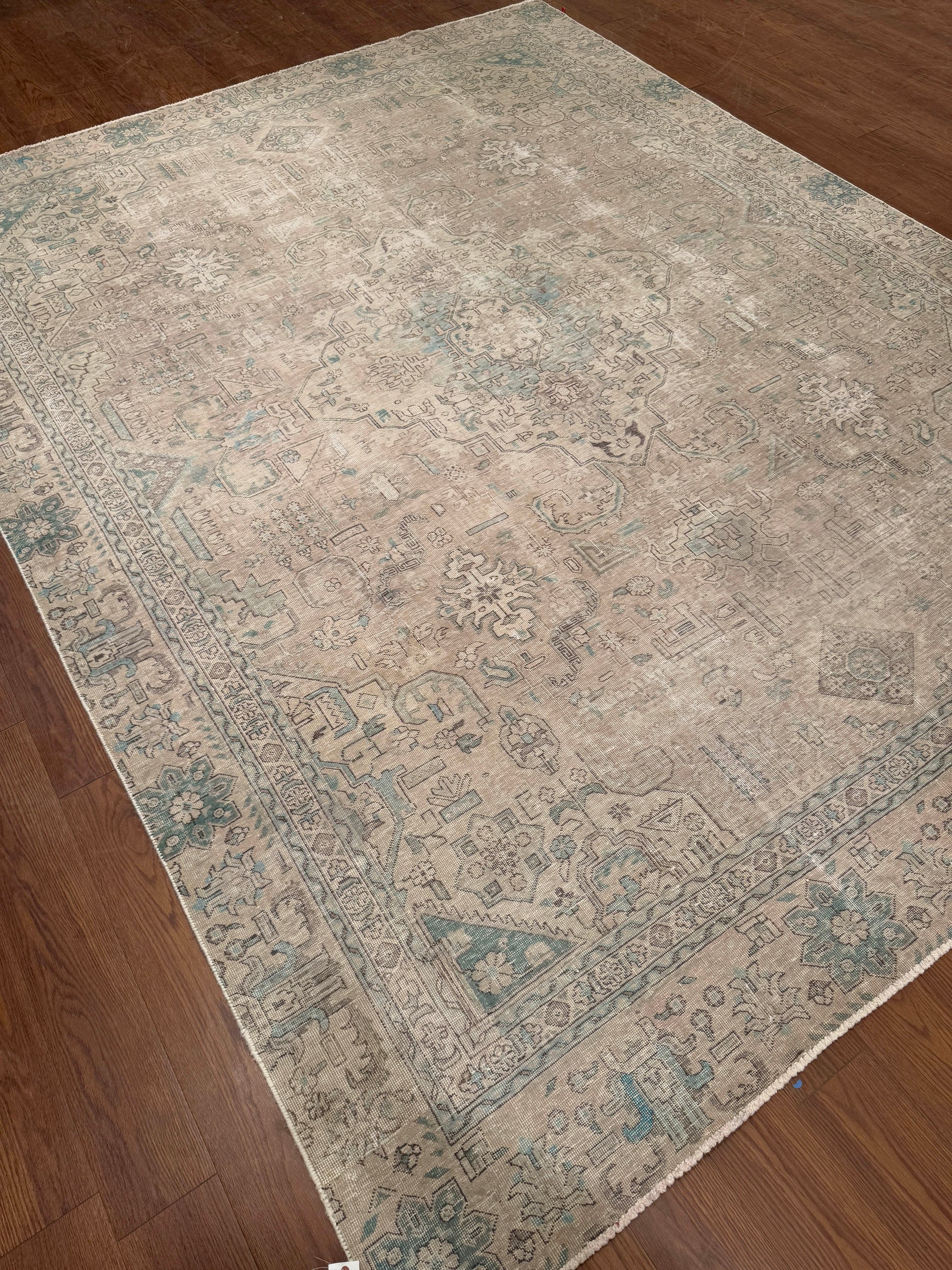 This handwoven rug showcases a graceful geometric medallion framed by intricate botanical and tribal motifs, rendered in a soothing palette of beige, taupe, and faded aqua. The gently distressed finish gives it an aged, heirloom character while maintaining a refined, contemporary balance. Its soft tones and intricate weaving make it ideal for spaces seeking calm sophistication and artisanal texture.