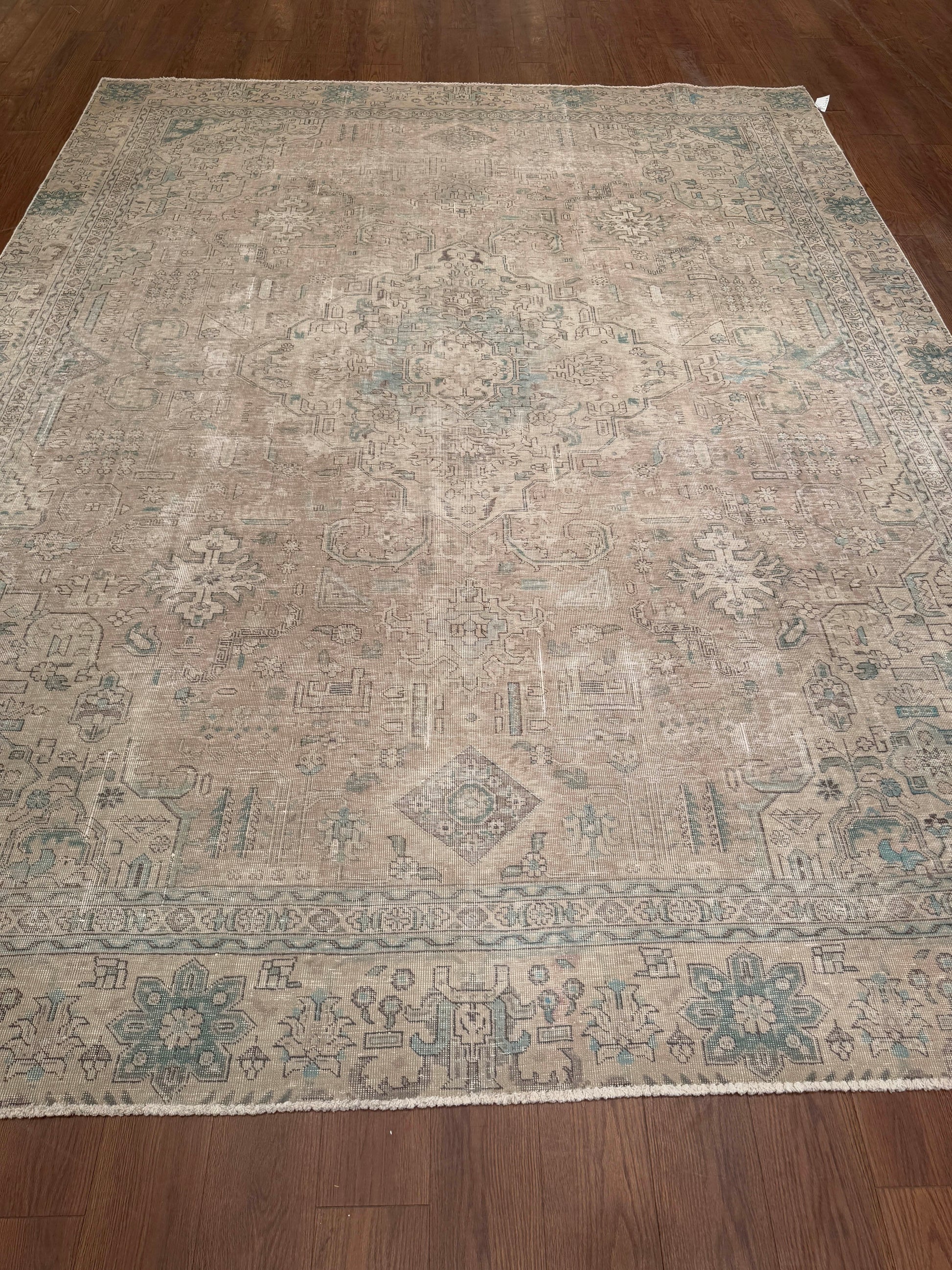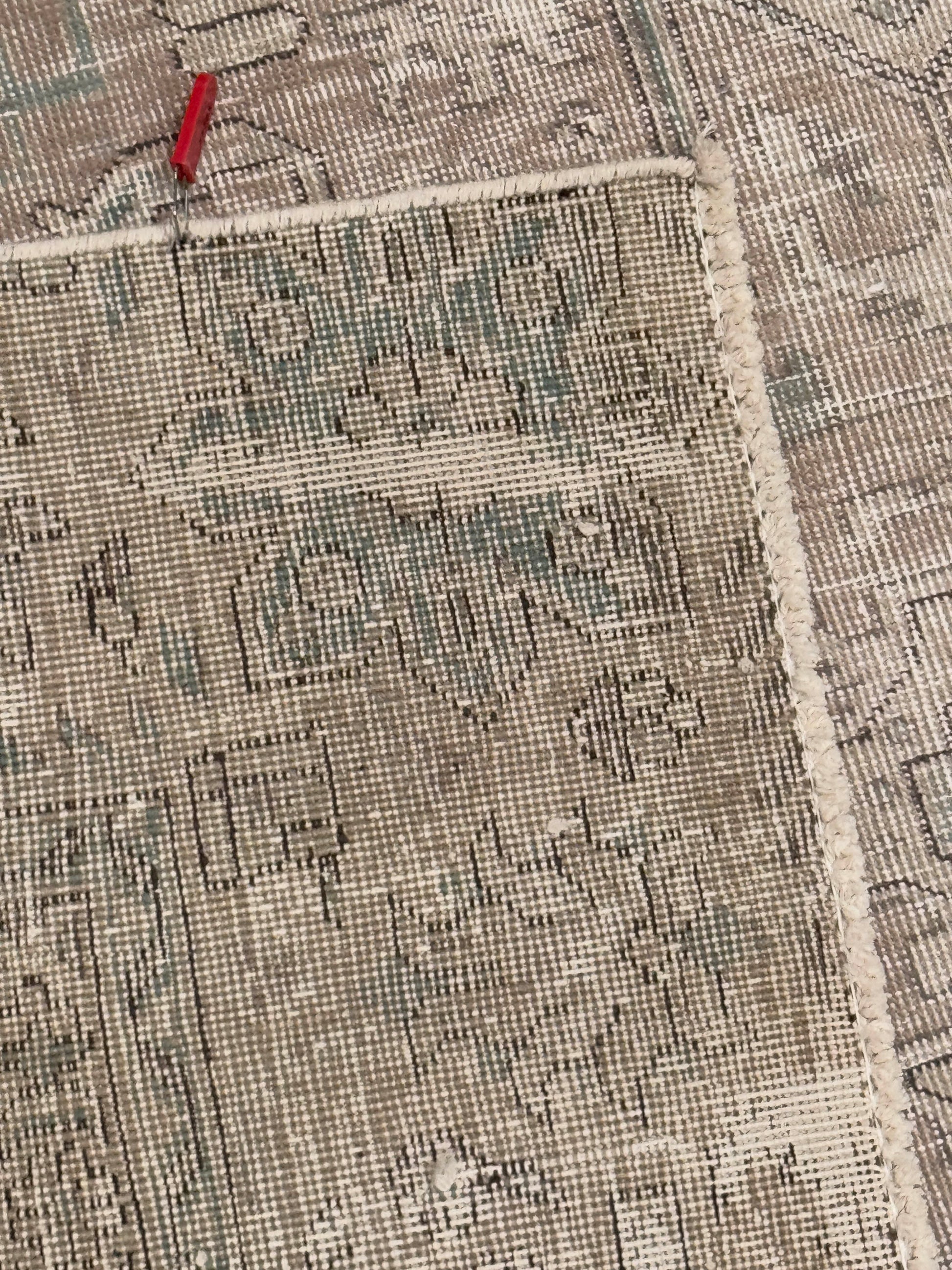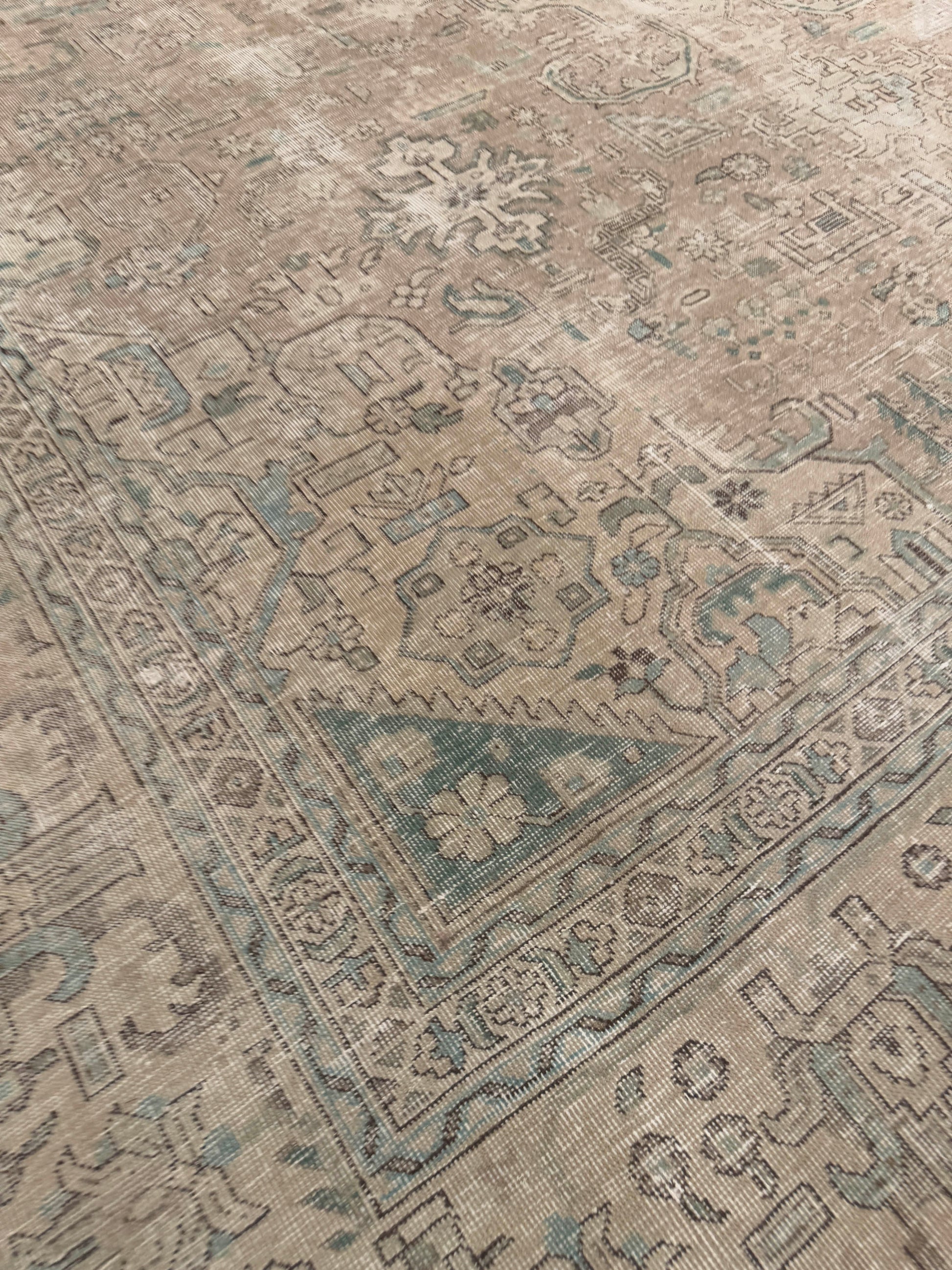 This handwoven rug showcases a graceful geometric medallion framed by intricate botanical and tribal motifs, rendered in a soothing palette of beige, taupe, and faded aqua. The gently distressed finish gives it an aged, heirloom character while maintaining a refined, contemporary balance. Its soft tones and intricate weaving make it ideal for spaces seeking calm sophistication and artisanal texture.