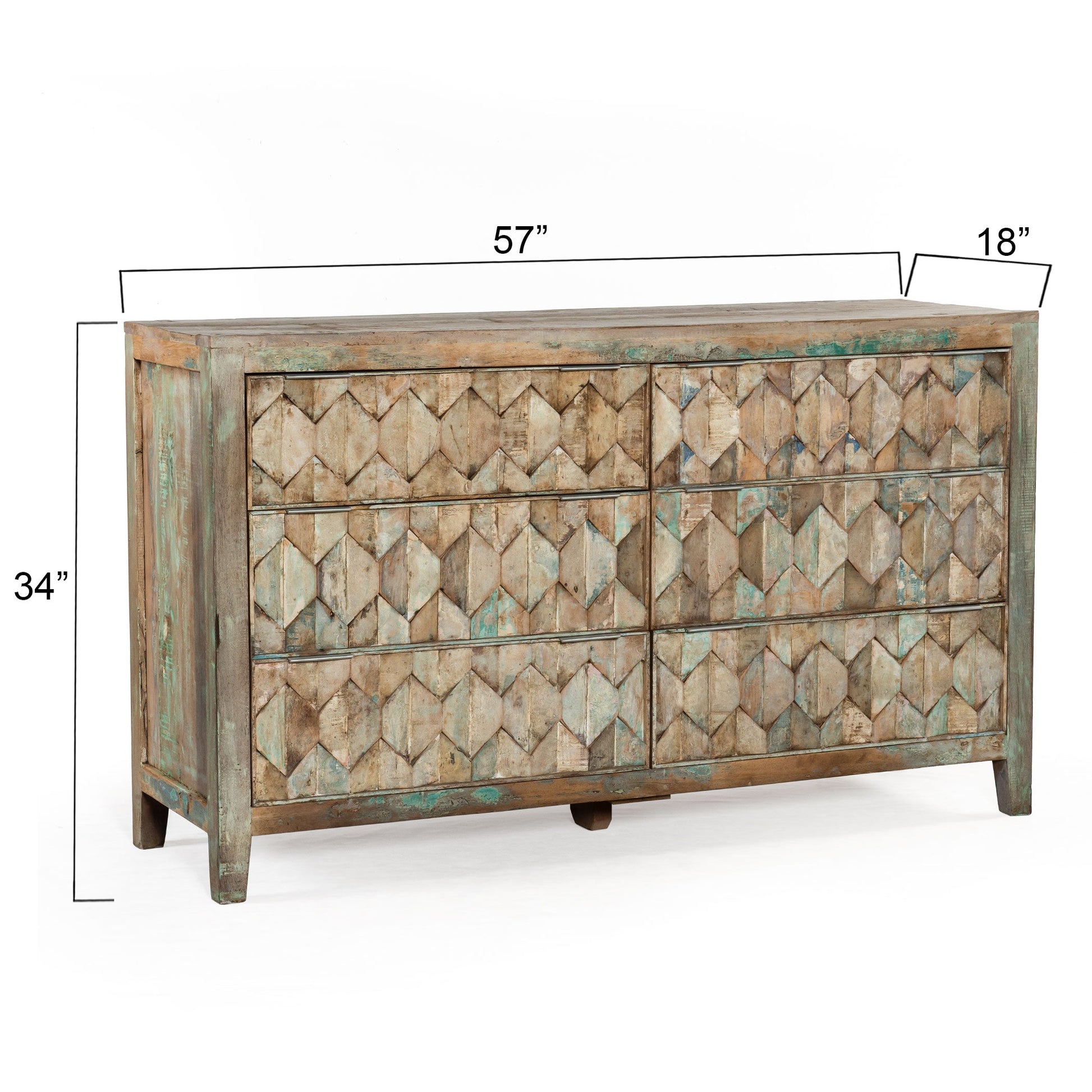 This dresser captures the breezy spirit of coastal design through its use of reclaimed hardwoods in a soft pastel finish. Each piece is handcrafted, blending modern and vintage influences with hand-carved detailing that adds depth and artistry. Natural imperfections, such as gentle cracks, dents, and patina variations, enhance its unique, timeworn character. With six drawers for ample storage, this dresser brings warmth, color, and individuality to relaxed, design-forward interiors.