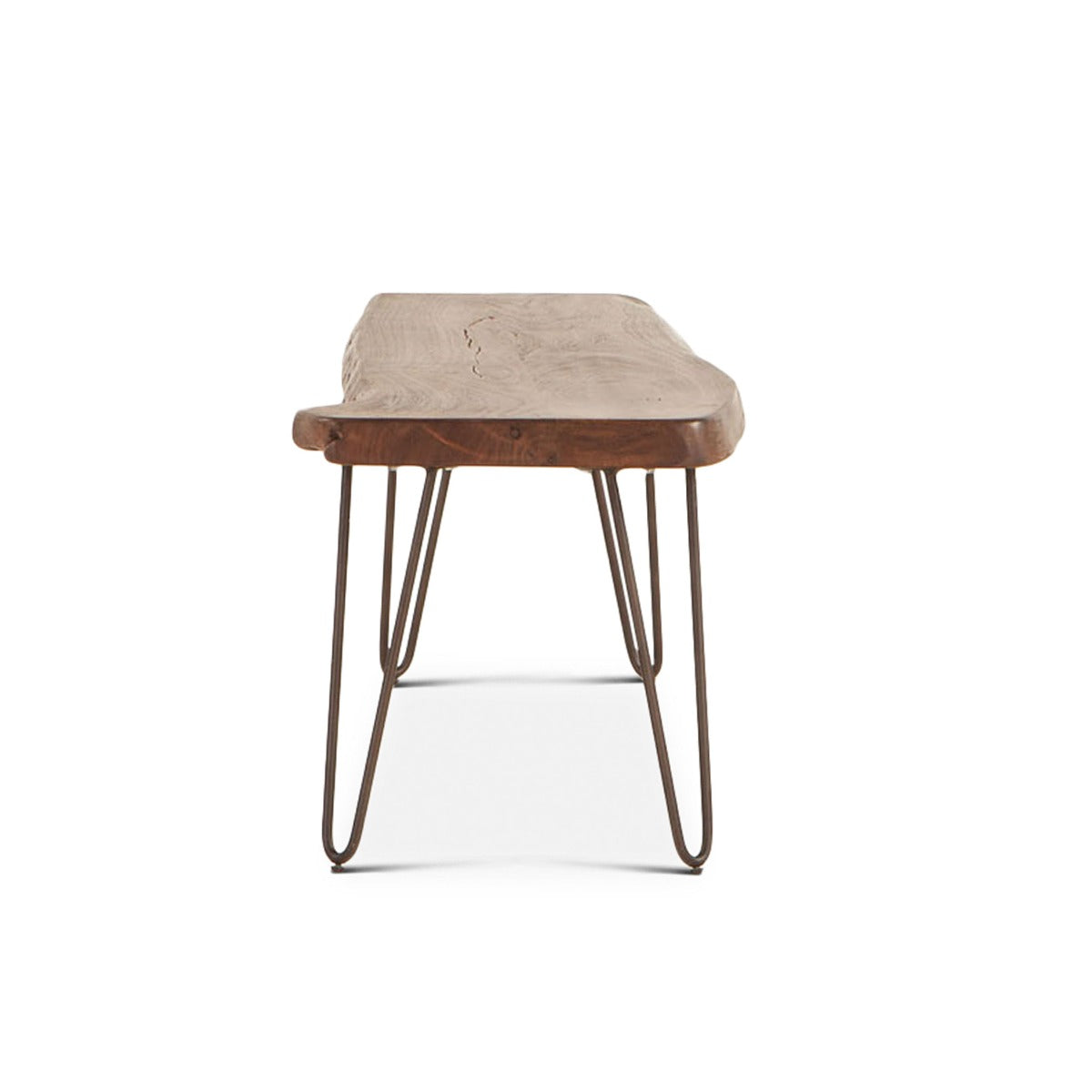 This bench blends mid-century inspiration with modern craftsmanship. Crafted from solid acacia wood in a warm walnut finish, it features a natural live edge that showcases the wood’s organic grain and character. The sleek antique zinc hairpin legs provide a sculptural, airy base, balancing rustic warmth with contemporary style. Perfect for dining rooms, entryways, or open living spaces, it offers durability, artistry, and timeless appeal.