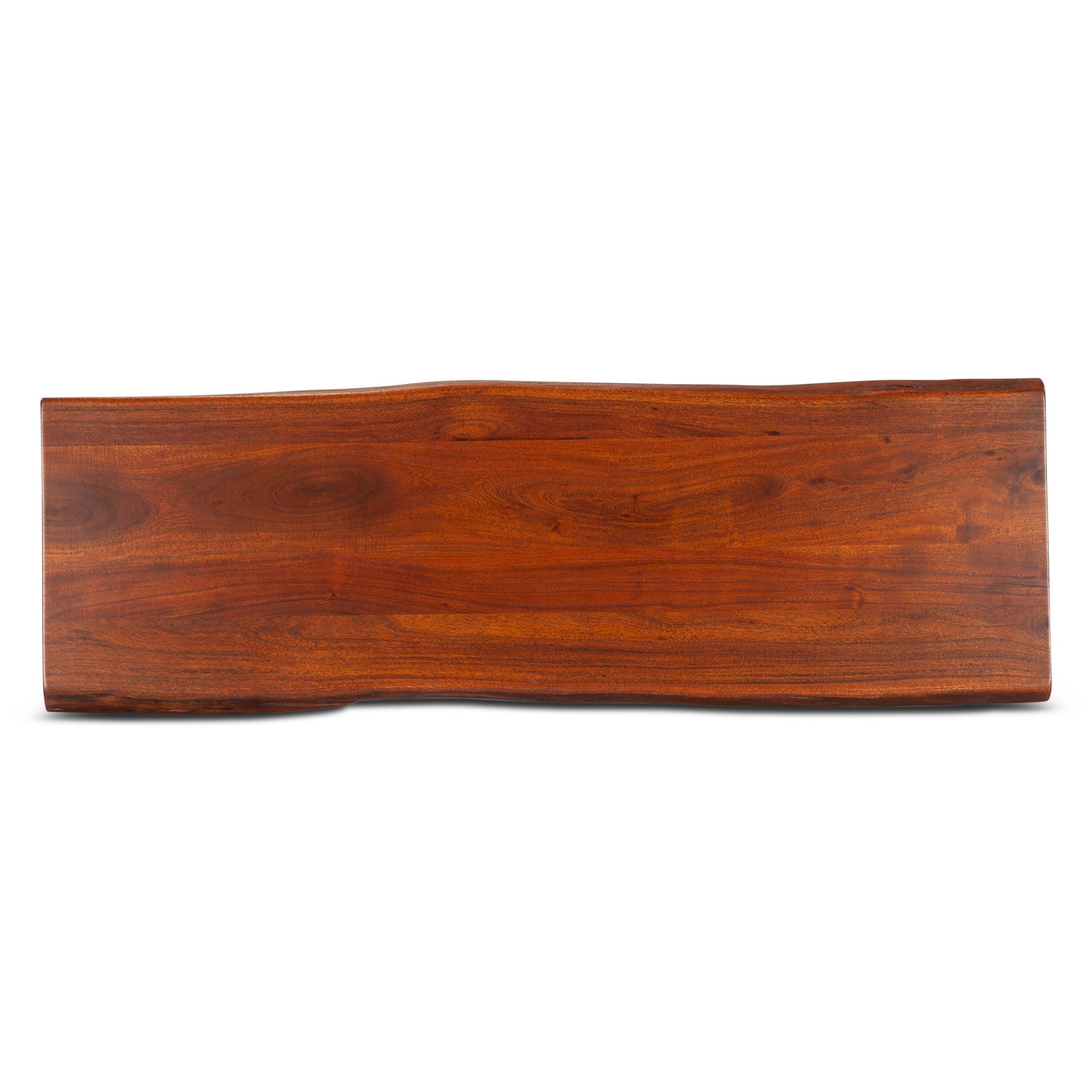 This bench combines modern simplicity with organic warmth. Crafted from solid acacia wood in a rich walnut finish, it features a faux live edge seat that emphasizes the natural grain and texture of the wood. The sleek black metal base provides stability and contrast, creating a balanced mid-century silhouette. Perfect for dining rooms, entryways, or open living spaces, it delivers durability, refinement, and timeless style.