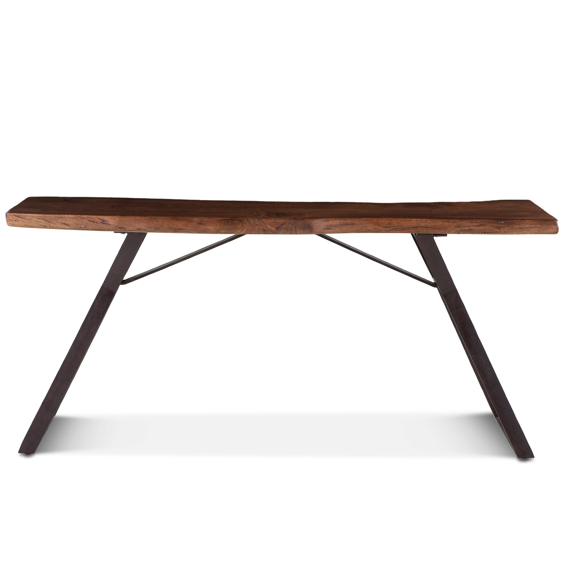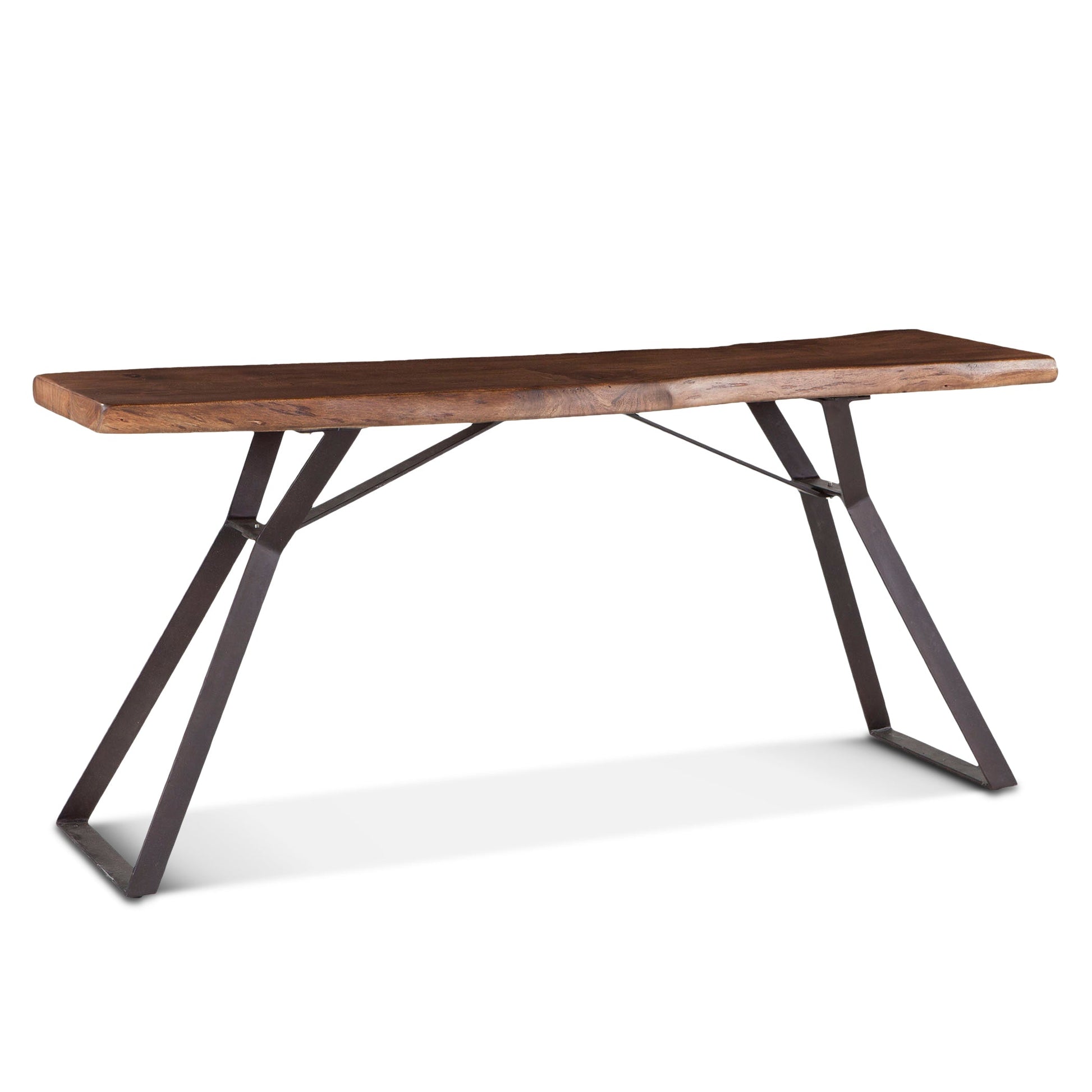 This console table embodies a perfect blend of natural beauty and sculptural craftsmanship. The thick acacia wood top, finished in warm walnut, features live-edge detailing that highlights the wood’s organic grain and character. Supported by tapered, inward-slanting iron legs, the piece balances rustic warmth with industrial refinement. Designed for curated interiors, it serves beautifully in entryways, living rooms, or behind a sofa, adding depth, balance, and timeless sophistication to any space.